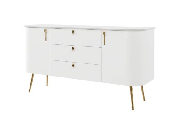Comoda cu 2 usi si 3 sertare GALET 158x82x47cm alb mat, picioare si manere auriu neon